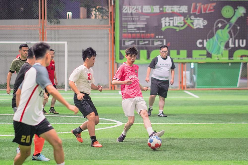 市民在南京市建邺区西城·夜未央运动街区踢足球(8月25日摄)。
