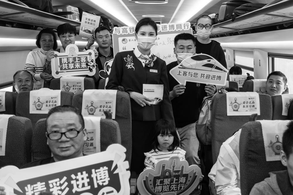 第六届中国国际进口博览会开幕在即,铁路上海客运段开展“与高铁相约 伴进博同行”主题活动,向旅客介绍进博会亮点,邀请旅客一起为进博会送上祝福。 新华社记者 王翔 摄