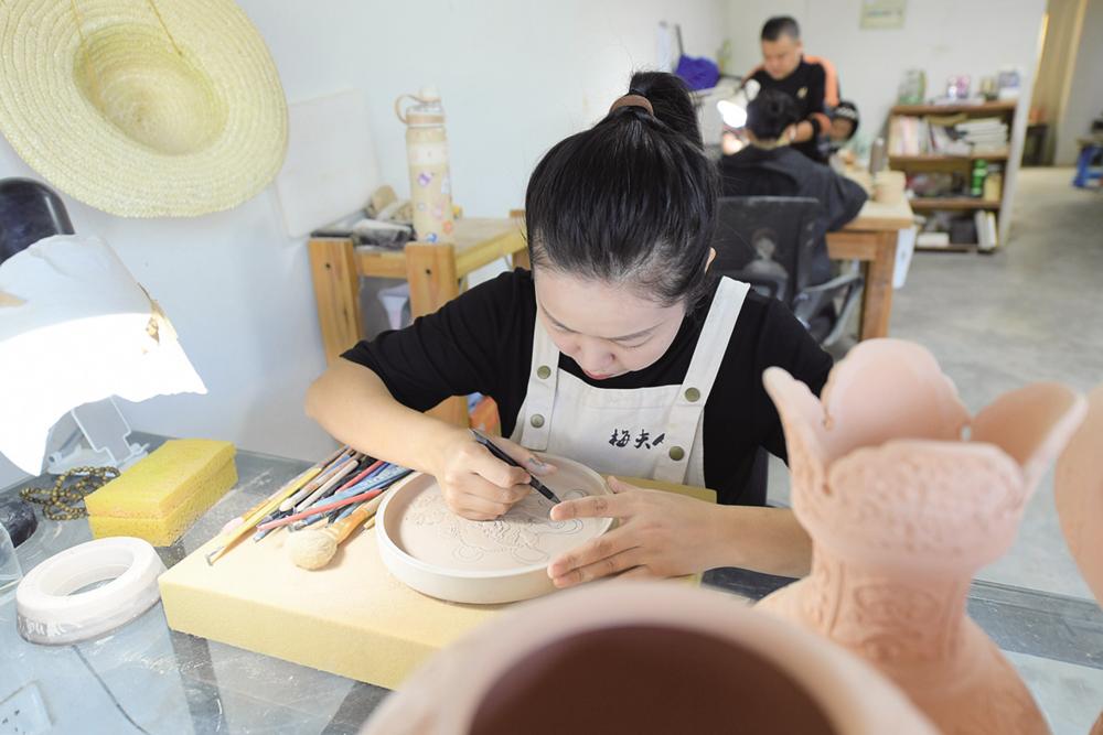 10月31日,在“梅夫人”工作室,季资美在瓷坯上刻绘。
