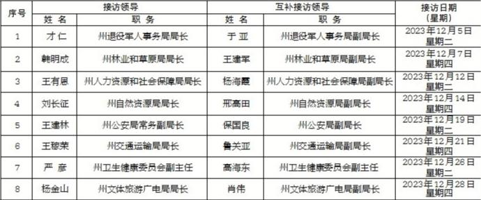 为进一步畅通信访渠道,根据《信访工作条例》和《海西州各级领导干部定期接待群众来访工作暂行办法》,海西州人民来访接待中心开展领导干部接访日活动,公开接待群众来访。现将12月接访领导安排公示如下: