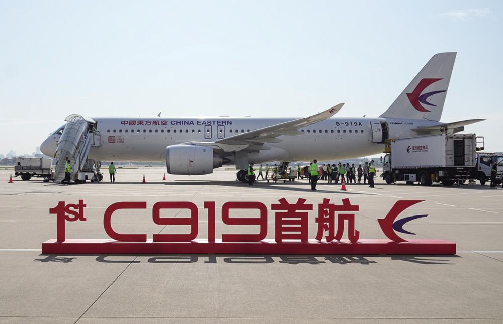 5月28日在上海虹桥国际机场停机坪拍摄的C919飞机。当日,由C919大型客机执飞的东方航空MU9191航班平稳降落在北京首都国际机场,标志着该机型圆满完成首个商业航班飞行,正式进入民航市场,开启市场化运营、产业化发展新征程。新华社记者 丁汀 摄
