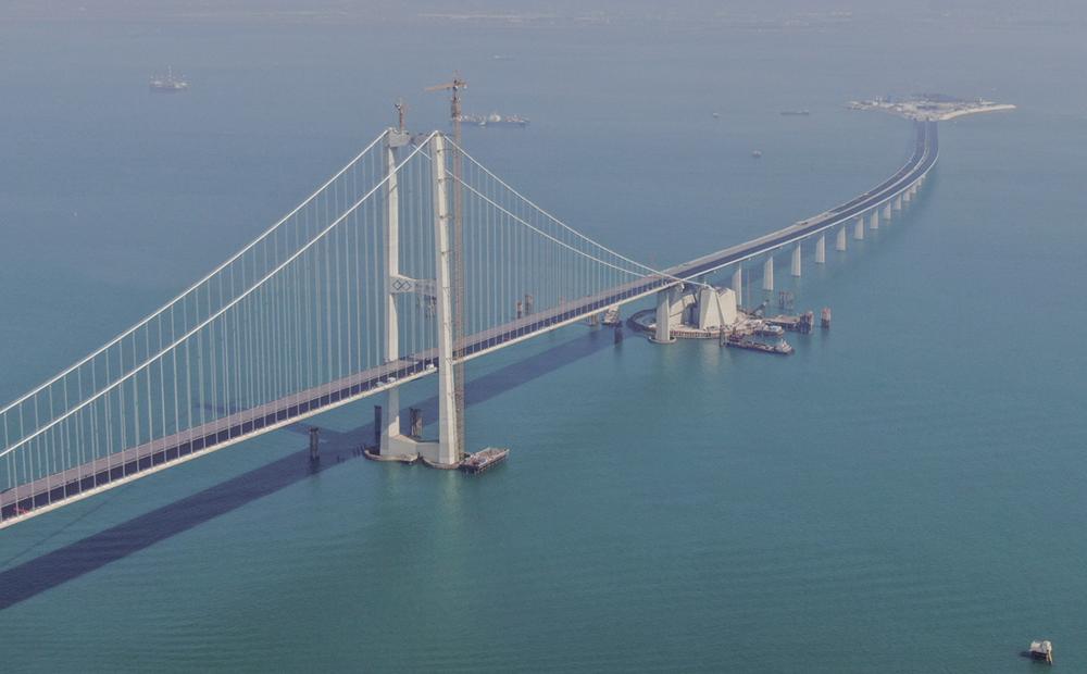 11月28日,粤港澳大湾区超级工程深中通道主线正式贯通,这是深中通道伶仃洋大桥东塔及西人工岛(无人机照片)。 新华社记者 邓华 摄