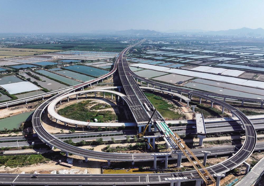 12月8日拍摄的广东鹤港高速高栏港枢纽(无人机照片)。全长34.5公里的鹤港高速东连港珠澳大桥西延线,西接黄茅海跨海通道,共同组成粤港澳大湾区基础设施“硬联通”交通主干线之一。新华社记者 刘大伟 摄