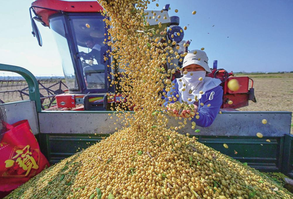 10月14日,在河南省洛阳市孟津区会盟镇黄河岸边的下古村,农民收获大豆。今年,我国继续提高小麦、稻谷最低收购价,完善玉米大豆生产者补贴,增加产粮大县奖励资金规模,扩大三大粮食作物完全成本保险和种植收入保险实施范围。新华社发(李卫超 摄)