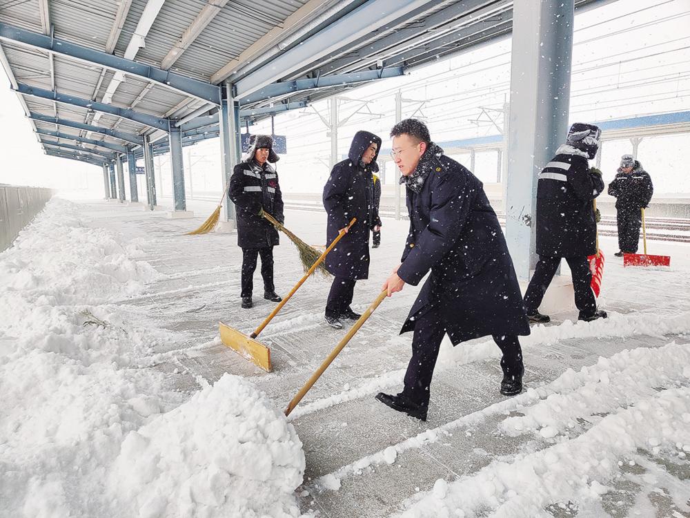 为满足旅客出行需求,德令哈站第一时间组织人员对站前广场、进站通道、站台等旅客走行区域积雪进行清扫撒盐,铺设防滑地垫,根据客流情况及时加开售票窗口,满足“急客”购票出行需求。同时,车站工作人员采取提前分流、提前检票、等候区候车、专人带队等有效举措,保障雪天旅客有序出行,加派人员对重点旅客开启“护送”模式,在上下台阶、站台乘降等安全关键环节加强盯控和重点帮扶。