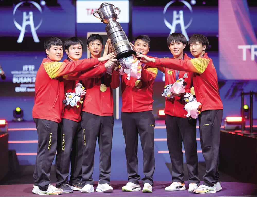 当日,在韩国釜山进行的2024年国际乒联釜山世界乒乓球团体锦标赛男子团体决赛中,中国队3比0战胜法国队,夺得冠军。