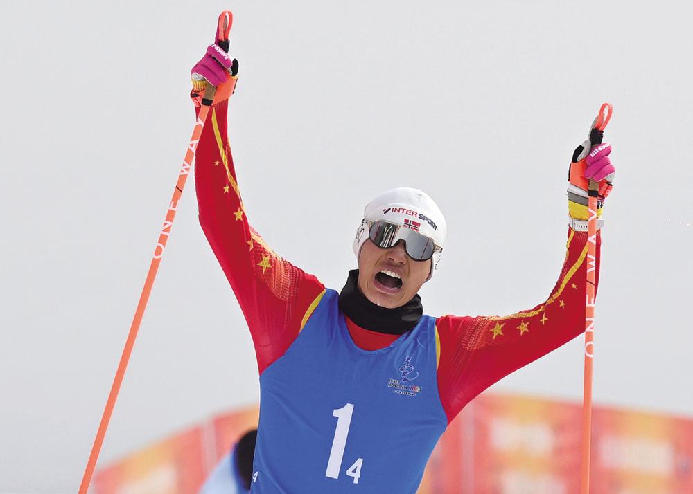 2月26日,吉林队选手潘梦男在冲过终点前庆祝。
