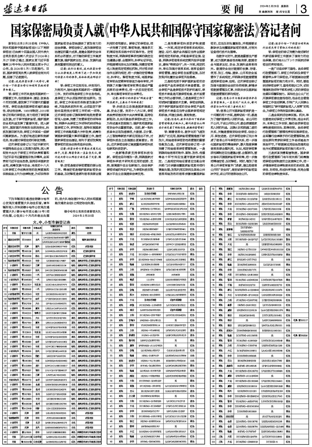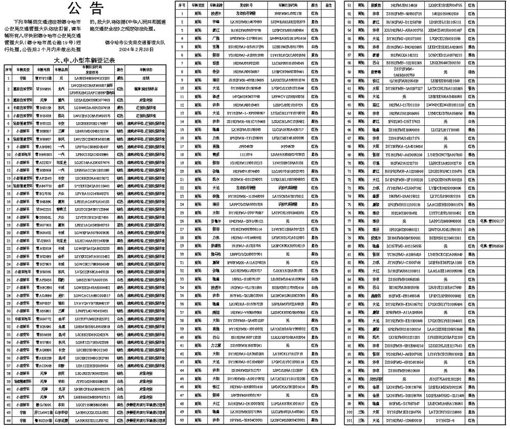 公 告 下列车辆因交通违法被德令哈市公安局交通管理大队依法扣留,请车辆所有人尽快到德令哈市公安局交通管理大队(德令哈市昆仑路19号)进行处理,公告后3个月内未做出处理的,我大队将依据《中华人民共和国道路交通安全法》之规定依法处理。 德令哈市公安局交通管理大队 2024年2月28日