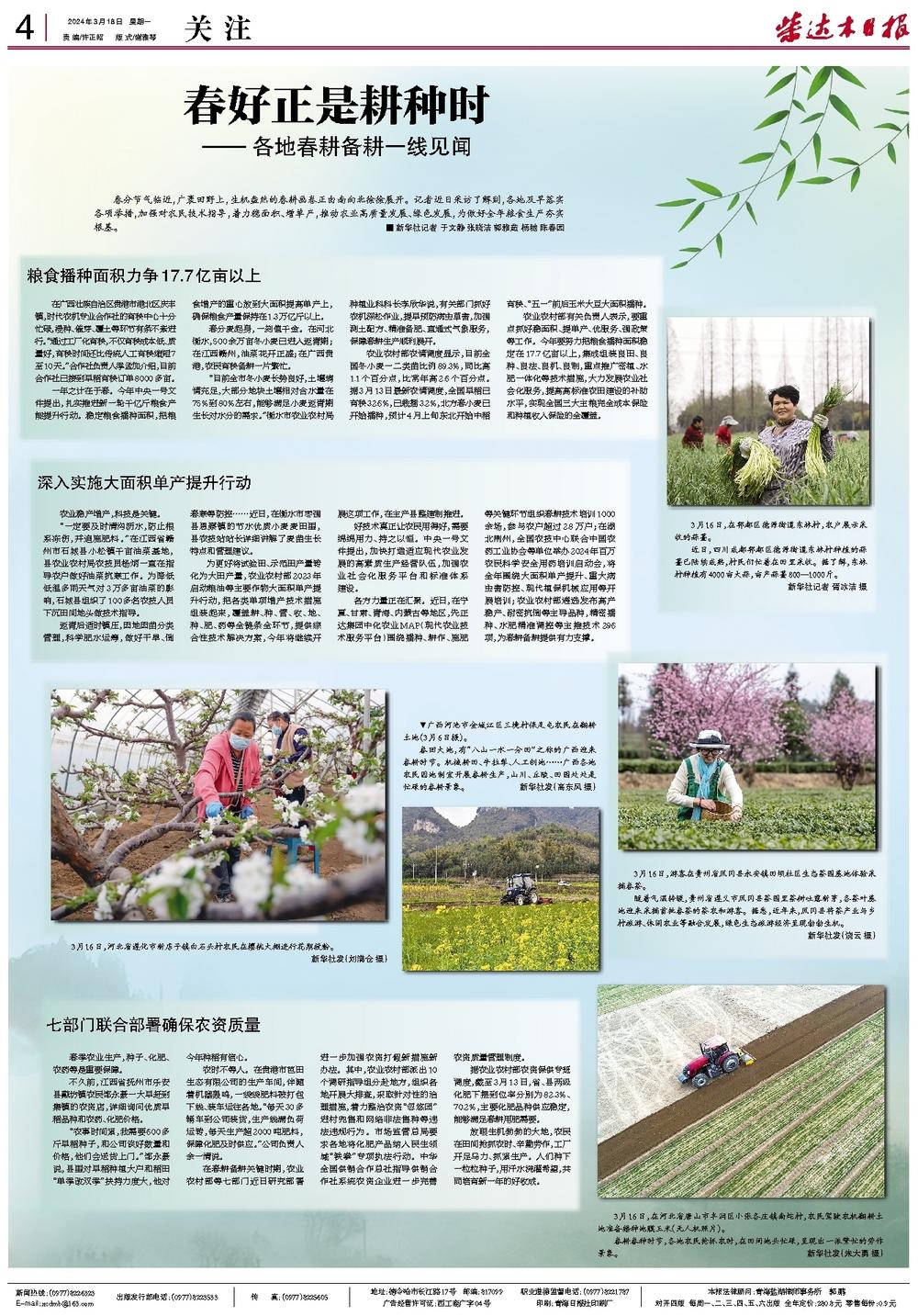 春分麦起身,一刻值千金。在河北衡水,500余万亩冬小麦已进入返青期;在江西赣州,油菜花开正盛;在广西贵港,农民育秧备耕一片繁忙。