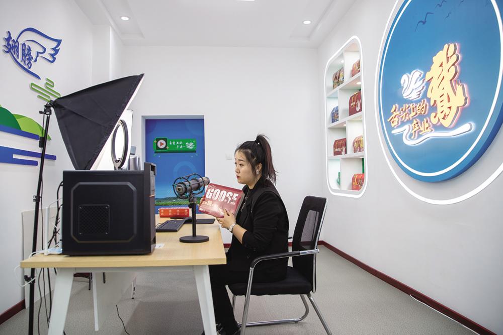 4月23日,在黑龙江省中林天恒食品有限公司电商直播间内,工作人员线上直播销售鹅制品。 新华社记者 张涛 摄