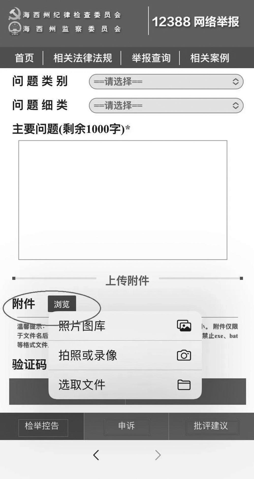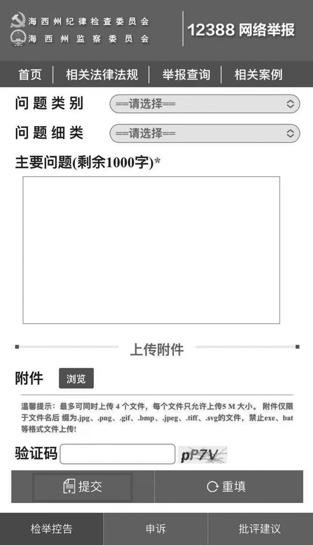 步骤八:选择要举报的类型为“检举控告”、“申诉”或“批评建议”,填写内容并添加附件后点击提交完成。