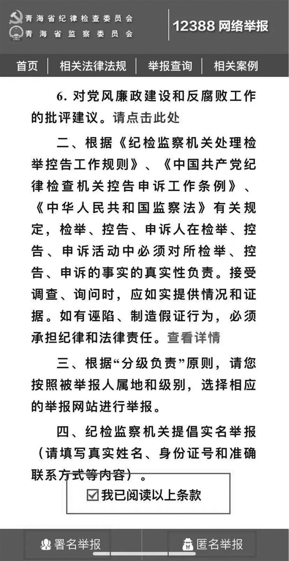 步骤三:打开如下页面,勾选最下方“我已阅读以上条款”选择“署名举报”或“匿名举报”