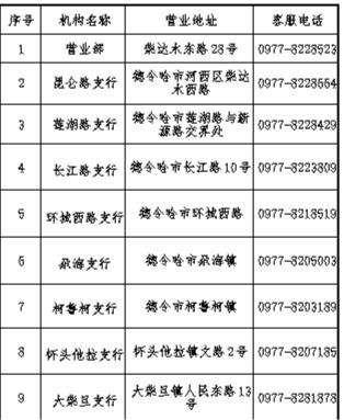本行共设9个营业网点,分别是营业部,昆仑路支行、莲湖路支行、长江路支行、环城西路支行、怀头他拉支行、柯鲁柯支行、尕海支行、大柴旦支行。各分支机构均为非独立核算单位,其经营管理活动根据总行授权进行,并对总行负责。