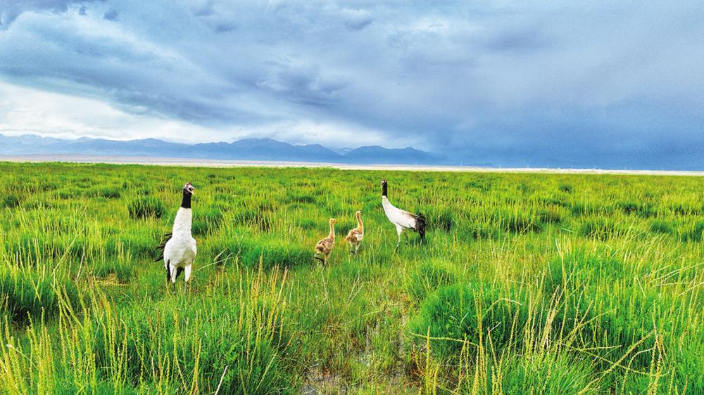 6月29日,记者在青海可鲁克湖——托素湖省级自然保护区拍摄到黑颈鹤“一家四口”同框的画面,只见黑颈鹤“夫妇”带着两只小黑颈鹤游弋、觅食,画面非常温馨。 本报记者 巴图那生 浩尔娃 摄影报道