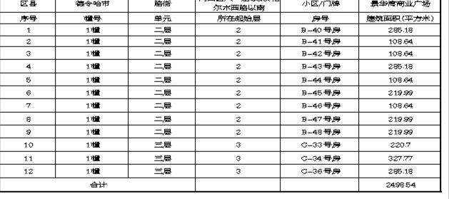 中国农业银行海西分行现有旺铺12套拟整体出售,面积2498.54平方米,位于德令哈市景华湾商业广场2层(9套)、3层(3套),商业繁华、交通便利,详情请垂询李经理,联系电话:13709779005,石经理,联系电话:18297271366。房屋信息如下: