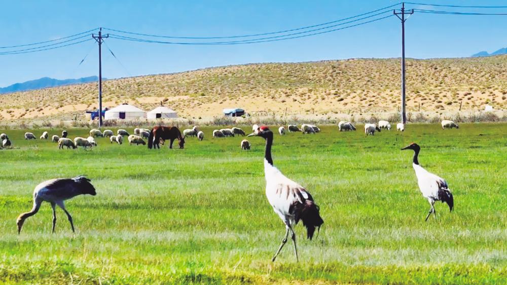 近日,乌兰县金子海沙漠公园附近的湿地上,黑颈鹤集体觅食的温馨画面,为秋日的乌兰增添了一份灵动与生机。 画面中,黑颈鹤跟在羊群身后,不紧不慢,时而引吭高歌,时而闲庭信步,时而低头觅食,尽享秋日暖阳。近年来,随着当地生态的不断变好,栖息在这片湿地的黑颈鹤数量不断增加,呈现出一幅鹤舞高原的生态画卷。 通讯员 任静 谢海群 巴格生 梁增燕 摄影报道