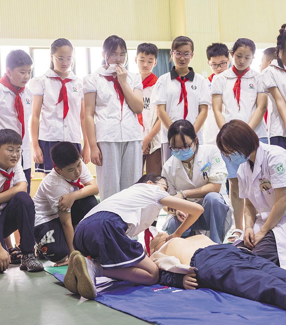 9月4日,在浙江省湖州市吴兴区龙泉小学,学生在医护人员指导下学习心肺复苏技能。 当日,浙江省湖州市吴兴区龙泉街道潘公桥社区开展“急救知识进校园”活动,组织专业医护人员向师生传授应急救护知识,提高师生们的应急救护能力。 新华社发(伊凡 摄)