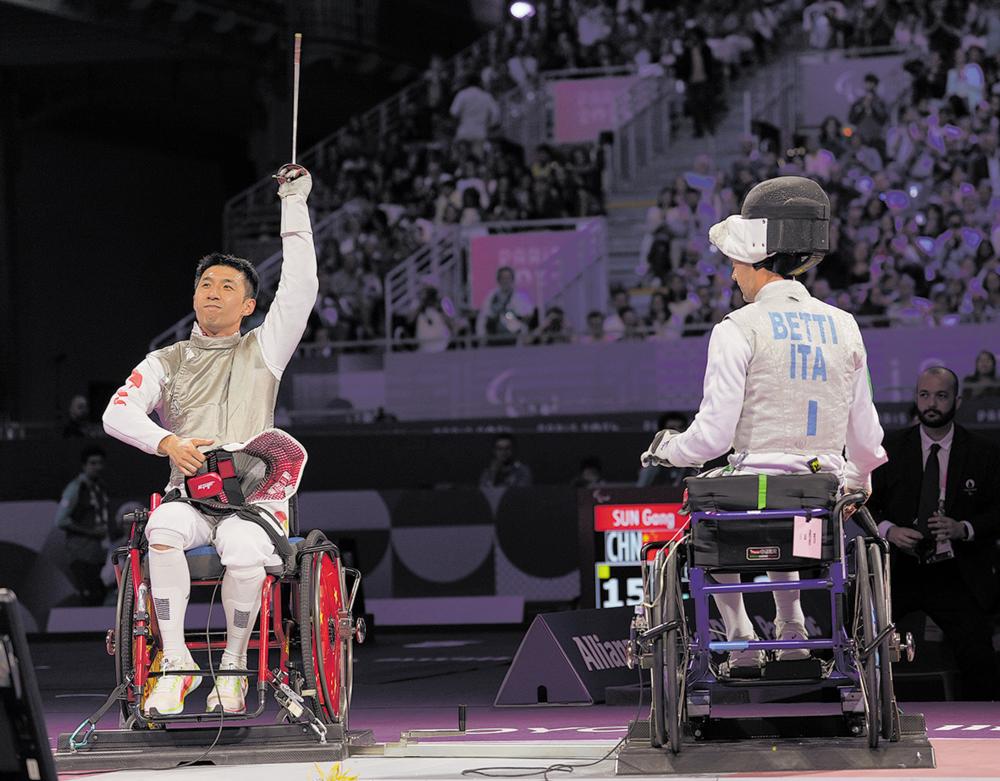 9月4日,孙刚(左)在比赛后庆祝胜利。 当日,在巴黎残奥会男子花剑个人A级决赛中,中国选手孙刚15比3战胜意大利选手贝蒂,获得冠军。 新华社记者 贺灿铃 摄