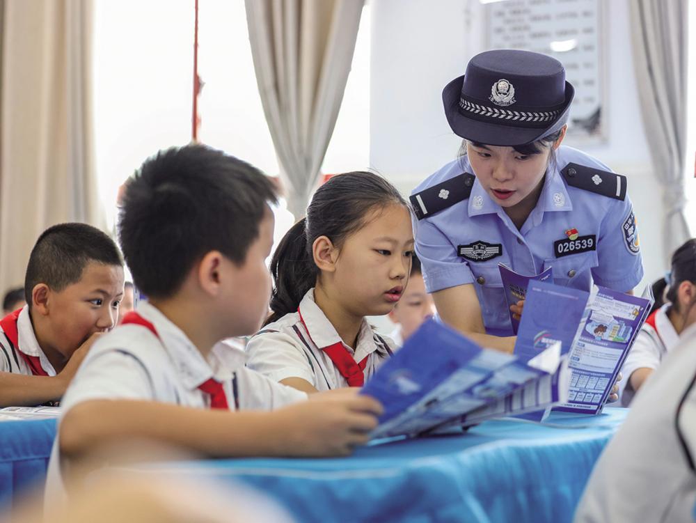 9月11日,公安民警在贵州省铜仁市玉屏侗族自治县印山民族小学给学生讲解网络安全知识。 9月9日至15日,以“网络安全为人民,网络安全靠人民”为主题的2024年国家网络安全宣传周在全国范围内统一开展。多地学校组织相关活动,宣传网络安全理念、普及网络安全知识、推广网络安全技能。 新华社发(胡攀学 摄)