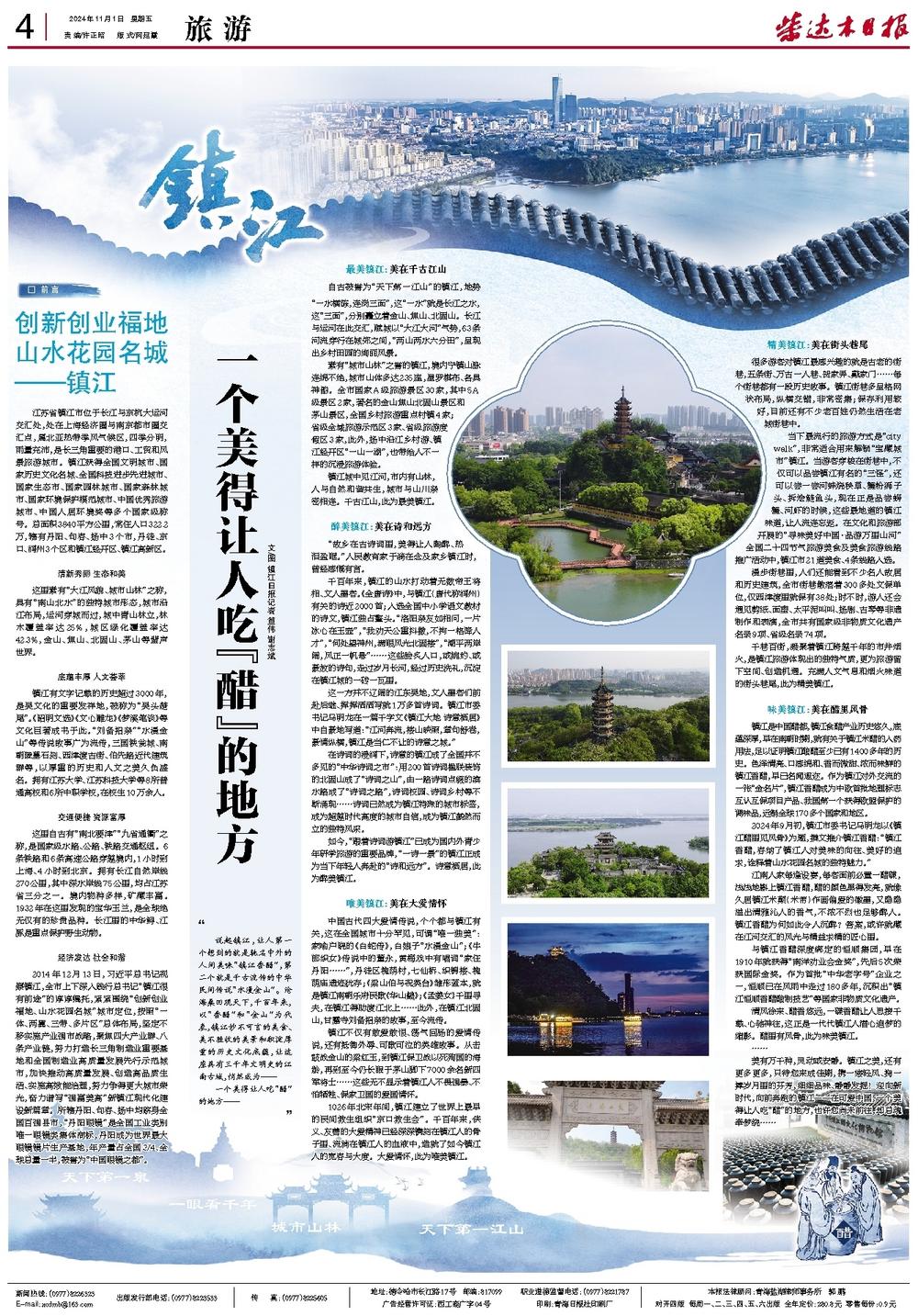 说起镇江,让人第一个想到的就是驰名中外的人间美味“镇江香醋”,第二个就是千古流传的中华民间传说“水漫金山”。沧海桑田观天下,千百年来,以“香醋”和“金山”为代表,镇江妙不可言的美食、美不胜收的美景和积淀厚重的历史文化底蕴,让这座具有三千年文明史的江南古城,悄然成为——