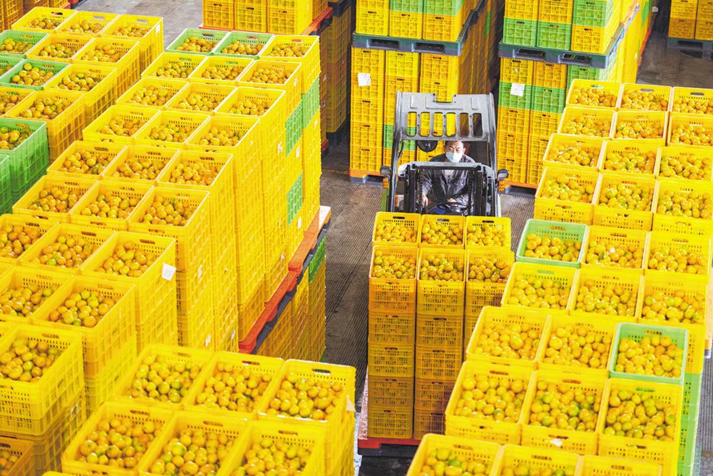11月1日,在石门县一柑橘加工厂,工人在运输柑橘。 近日,湖南省常德市石门县种植的柑橘进入收获期,果农们趁着晴好天气抓紧采摘、销售,田间地头和柑橘加工厂内一派繁忙景象。 石门县位于湖南省西北部,气候条件适宜柑橘种植。该县现有柑橘种植面积约45万亩,拥有柑橘类龙头企业9家、柑橘专业合作社377家,建成柑橘类加工厂182家,柑橘商品化处理率超75%,2023年柑橘产业综合销售收入达17.81亿元。 新华社记者 陈思汗 摄