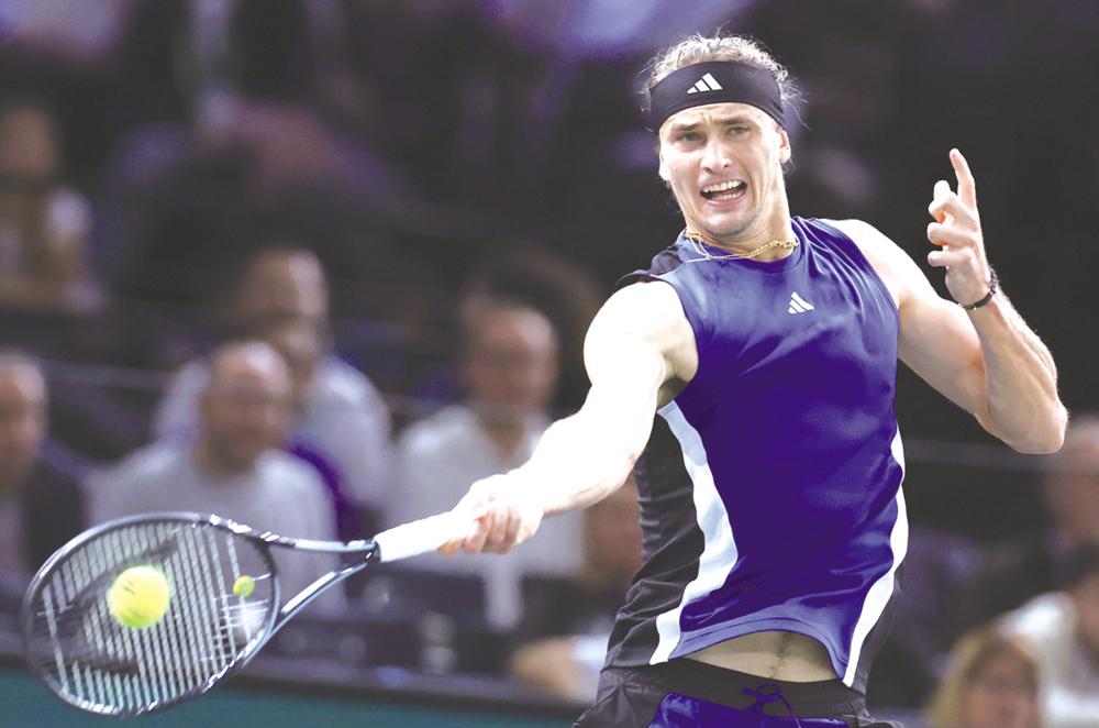 10月31日,兹维列夫在比赛中回球。 当日,在2024巴黎网球大师赛男子单打八分之一决赛中,德国选手兹维列夫2比1战胜法国选手菲斯,晋级八强。新华社记者 高静 摄