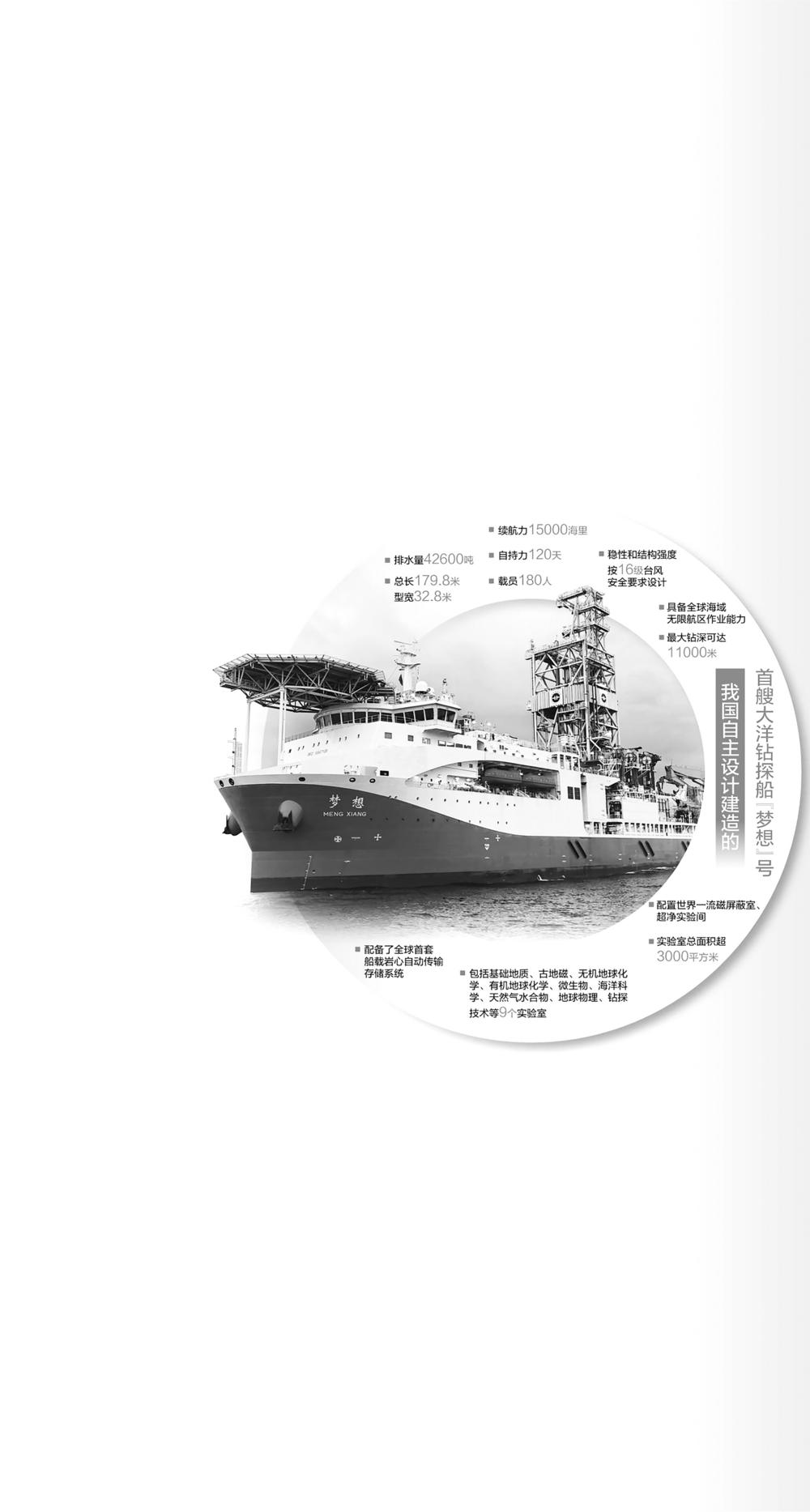 “想在海上钻探,还要做实验,船舶稳定性是重要前提因素。‘梦想’号可在6级海况下正常作业、16级台风下安全生存。”“梦想”号总设计师张海彬介绍,船只33000吨,总长179.8米,型宽32.8米,排水量42600吨,续航力15000海里,载员180人,在不进行补给的情况下可连续在海上工作120天,吃水深度9.2米,满足全球主要海域桥梁通行及码头停靠条件。
