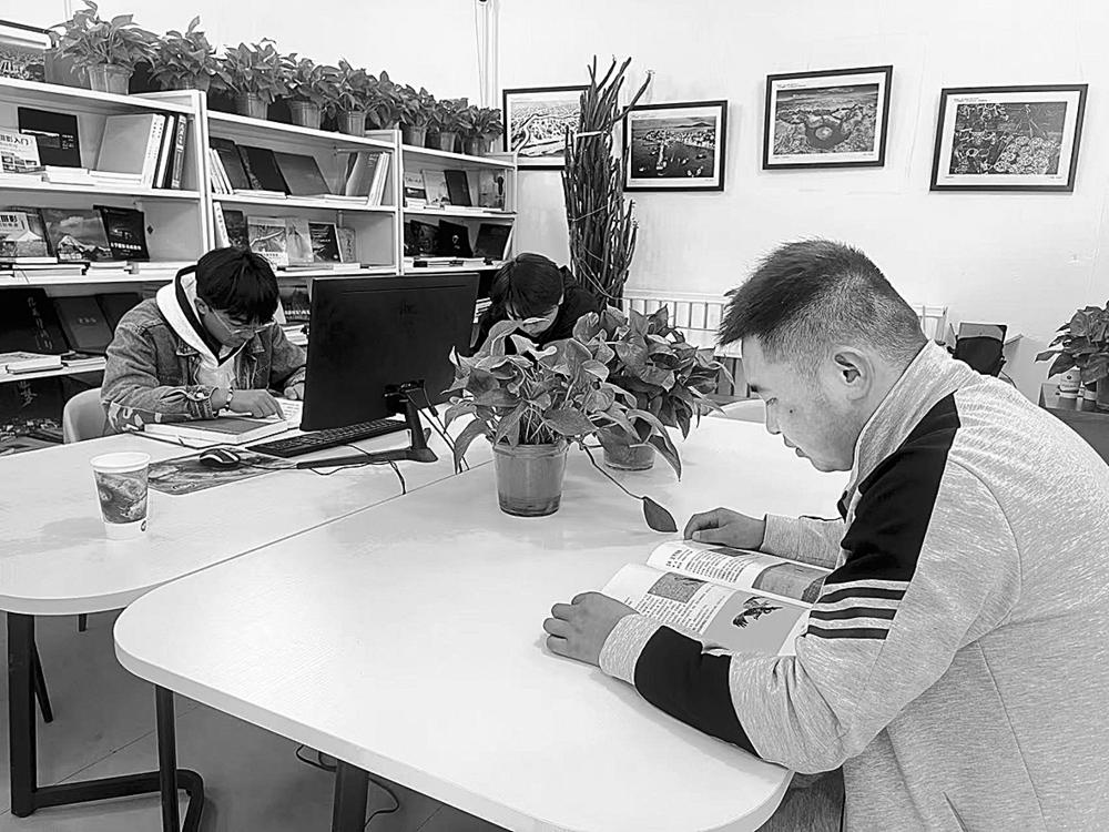 走进茫崖市浙江援青公益摄影图书馆,各类摄影书籍在书架上整齐排列,黑独山、环形地貌、艾肯泉等旅游景区和水鸟、猞猁、棕熊、高原狼等保护动物为主题的生态摄影作品在墙面上一一展出,几名读者正捧着摄影书籍在认真阅读。