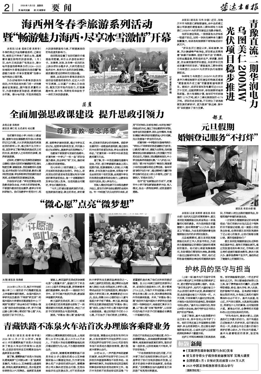 “项目自开工建设以来,面临高寒、缺氧、风沙肆虐等严峻考验,项目部全员秉持着‘缺氧不缺精神、艰苦不缺干劲’的精神,没有丝毫退缩,积极组织生产,保质量、控进度,安全高效推进项目建设,目前项目已完成容量并网的目标。”青豫直流二期华润电力乌图美仁200MW光伏项目执行经理邵振臣说。