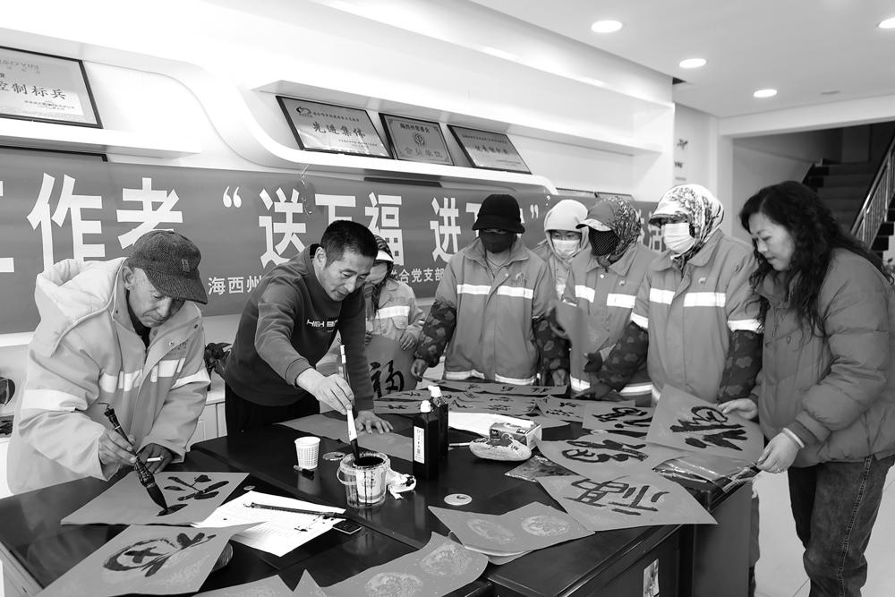 ▲ 春节将至,岁寒情深。1月15日,州住房和城乡建设局联合党支部、海西州住房和城乡建设局工会委员会、海西州城市管理综合行政执法局联合举办“送万福 进万家”书法公益活动,向辛勤劳作的环卫工人们送上新春的美好祝福。 活动中,德令哈市侨银环保科技有限公司开展了“福利暖人心 感恩环卫人”春节福利发放活动,为坚守在城市清洁一线的工作人员送上了一份浓浓的关爱和新春的祝福。 本报记者 查宝音 摄影报道