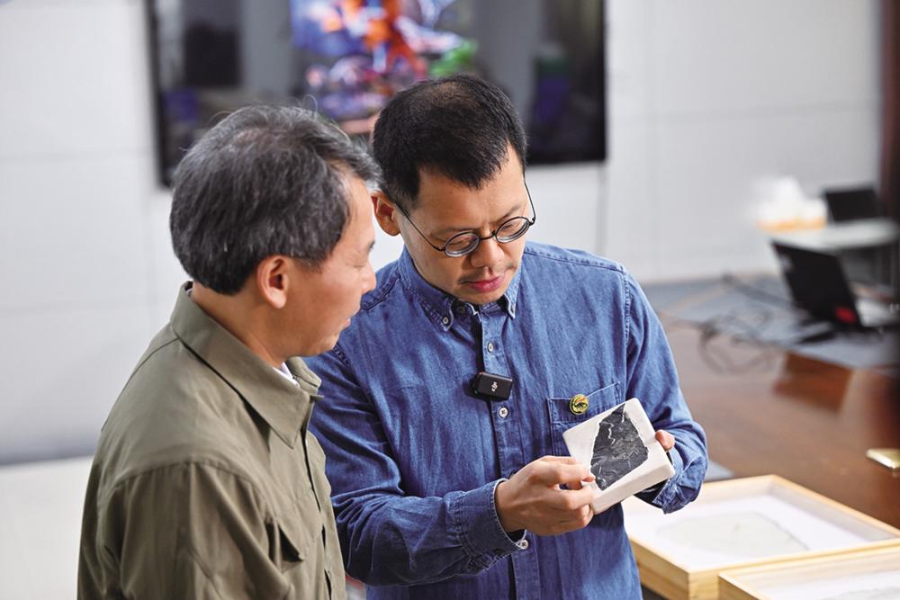 2月11日,古脊椎所王敏研究员(右)与福建地调院教授级高工陈润生在查看政和八闽鸟化石标本复制样本。 近日,中国科学院古脊椎动物与古人类研究所王敏团队和福建省地质调查研究院团队联合对新发现鸟类化石——“政和八闽鸟”的研究,揭示了现代鸟类的体型结构在侏罗纪晚期(距今1.5亿年)就已经出现,将以尾综骨为代表的重要特征的出现时间提早了近2000万年。相关研究成果于北京时间2月13日在《自然》杂志上发表。新华社记者 姜克红 摄