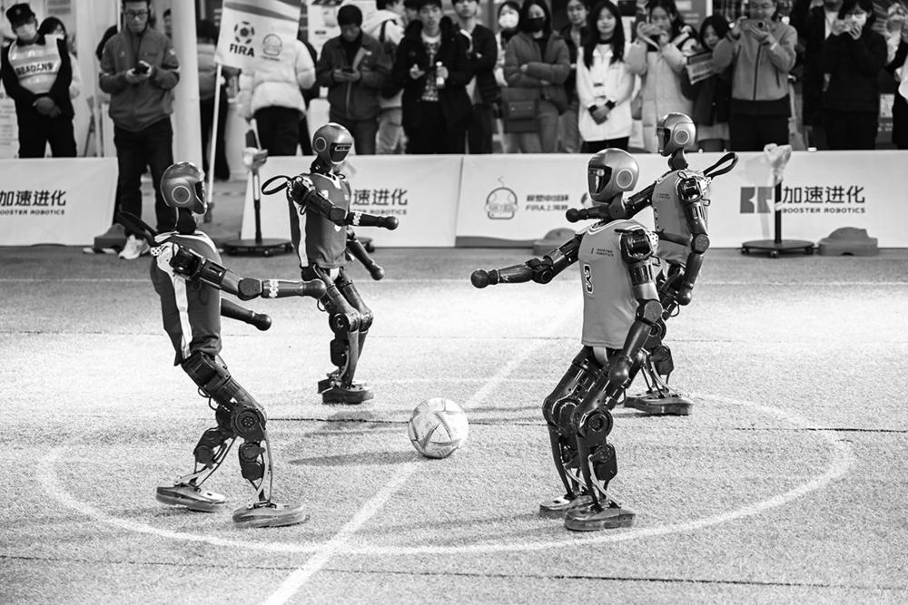 2月21日,机器人在2025全球开发者先锋大会现场踢足球。 2月21日至23日,以“模塑全球 无限可能”为主题的2025全球开发者先锋大会在上海举办。据悉,全球开发者先锋大会源自世界人工智能大会,定位为开发者“社区的社区”,已举办两届。新华社发(陈浩明 摄)