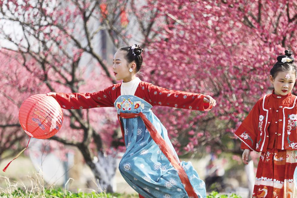3月1日,在浙江省嘉兴市秀洲区王店镇南梅村梅园,身穿汉服的小朋友在游园赏梅。 春暖花开、万物复苏,正是踏青赏景的好时节。人们走出家门,乐享春日时光。 新华社发(金鹏 摄)