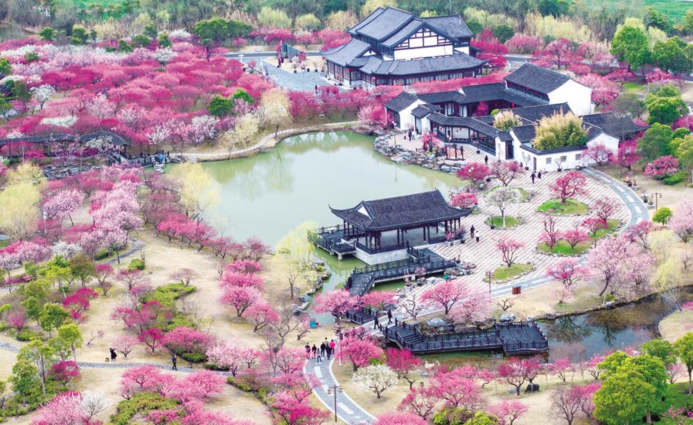 3月15日,游客在江苏省盐城市大丰区梅花湾景区赏花游玩(无人机照片)。 春暖花开,万物复苏,生机盎然的春日画卷在神州大地徐徐展开。新华社发(周社根 摄)