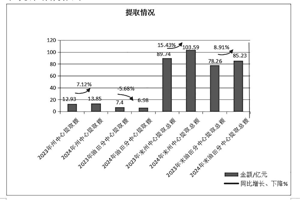 提取金额。提取额20.83亿元,其中,州中心13.85亿元,同比增长7.12%,油田分中心6.98亿元,同比下降5.68%;提取额占当年缴存额的70.90%,比上年减少3.13个百分点。截止2024年末,提取总额188.82亿元,其中,州中心103.59亿元,同比增长15.43%,油田分中心85.23亿元,同比增长8.91%。