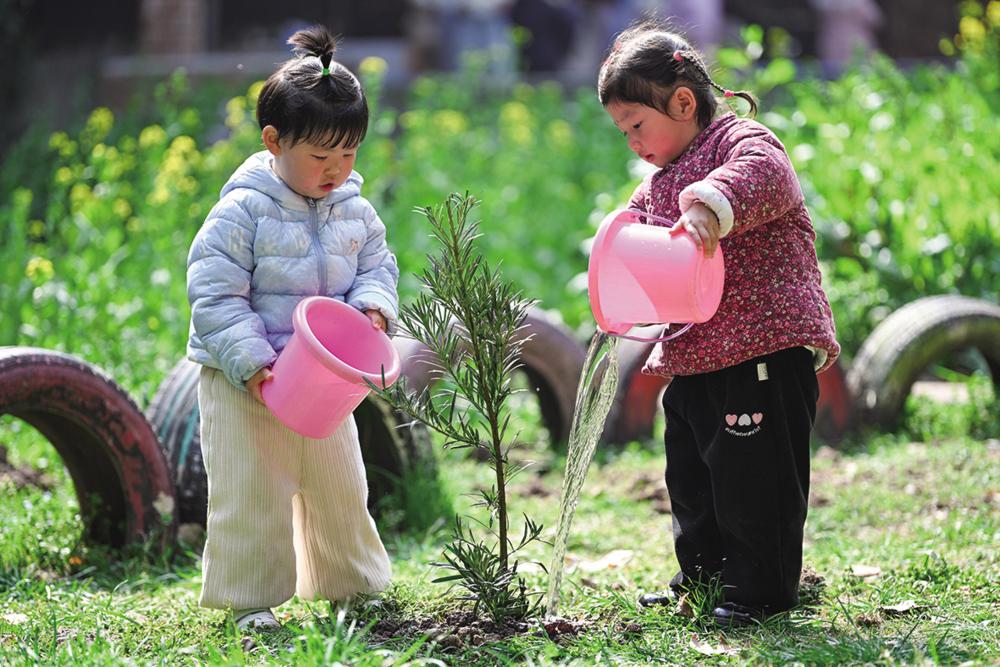 近日,植树节前,江苏省南京市建邺区金地名京幼儿园的孩子们在校园里为树苗浇水。 新华社发(方东旭 摄)