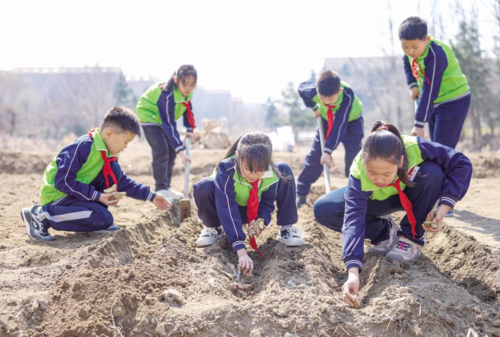 3月20日,在山东省荣成市府新小学劳动实践基地,学生们在菜园里种土豆。 当日是春分节气,各地开展各类春分节气品民俗活动。新华社发(李信君 摄)