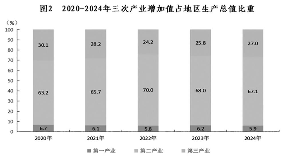 全年规模以上工业^[4]增加值同比下降3.1%。按经济类型分,国有企业增加值增长16.6%,股份制企业增加值下降3.4%,外商及港澳台商投资企业增加值增长18.8%;按门类分,采矿业增加值增长13%,制造业增加值下降9.3%,电力、热力、燃气及水生产和供应业增加值增长12.1%;按产业分,新材料产业增加值增长109.2%,特色生物产业增加值增长15.9%,新能源产业增加值增长15.5%,煤化工产业增加值增长6.4%,油气化工产业增加值增长4.2%,金属冶金产业增加值下降1.6%,盐湖化工产业增加值下降8.5%。