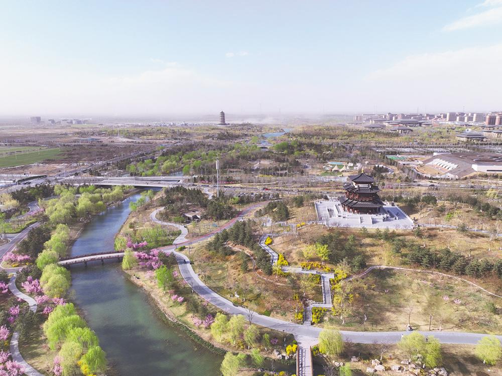 4月1日拍摄的雄安新区悦容公园(无人机照片)。 从“一片地”绘就“一张图”,再根据高标准规划蓝图建起“一座城”,春日雄安,到处涌现着热火朝天的建设场面,澎湃着高质量发展的活力。新华社记者 邢广利 摄