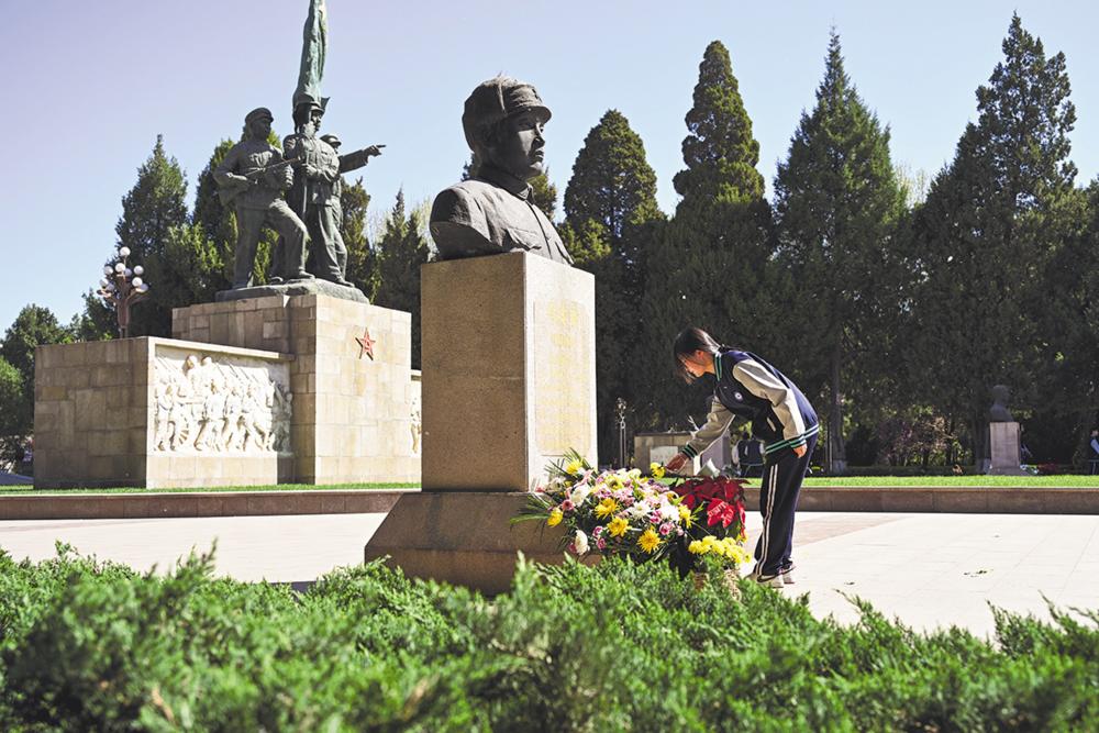 ↑4月1日,在位于石家庄市的华北军区烈士陵园,一名学生向烈士塑像献花。 清明将至,各地开展祭奠活动,缅怀先烈,寄托哀思。 新华社记者 刘金海 摄
