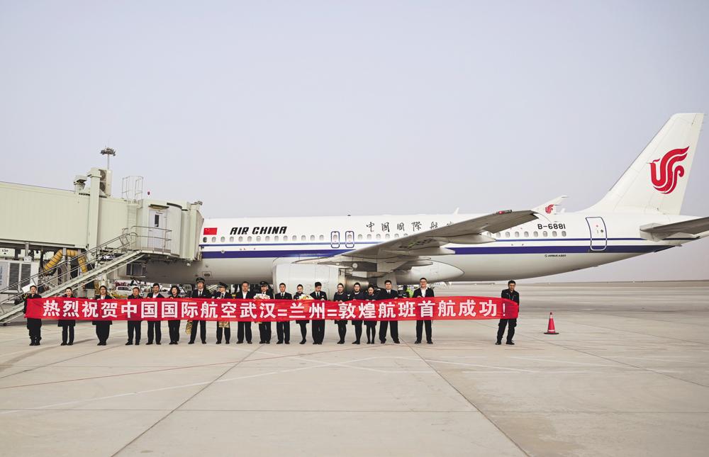 4月1日,在甘肃敦煌莫高国际机场,武汉—兰州—敦煌首航航班机组人员与机场工作人员合影。 当日,由中国国际航空公司执飞的武汉—兰州—敦煌航线正式开通,每周二、四、六执行,为地区间文化交流、旅游合作和经贸往来搭建起便捷的空中通道。 新华社发(张晓亮 摄)
