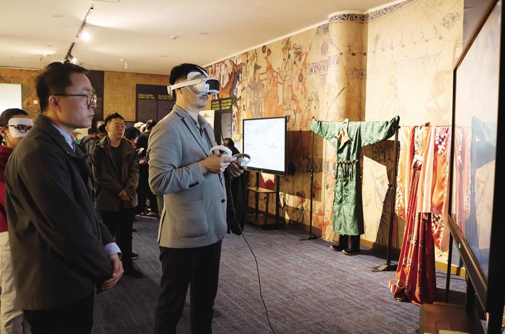 4月3日,在蒙古国首都乌兰巴托,嘉宾在活动上体验“寻境敦煌——数字敦煌沉浸展”。 为期三天的“敦煌文化周”——当敦煌遇见乌兰巴托主题交流活动3日在蒙古国首都乌兰巴托拉开帷幕。活动旨在让更多蒙古国民众近距离了解敦煌文化,增进中蒙两国民心相通。 新华社发 苏力雅 摄