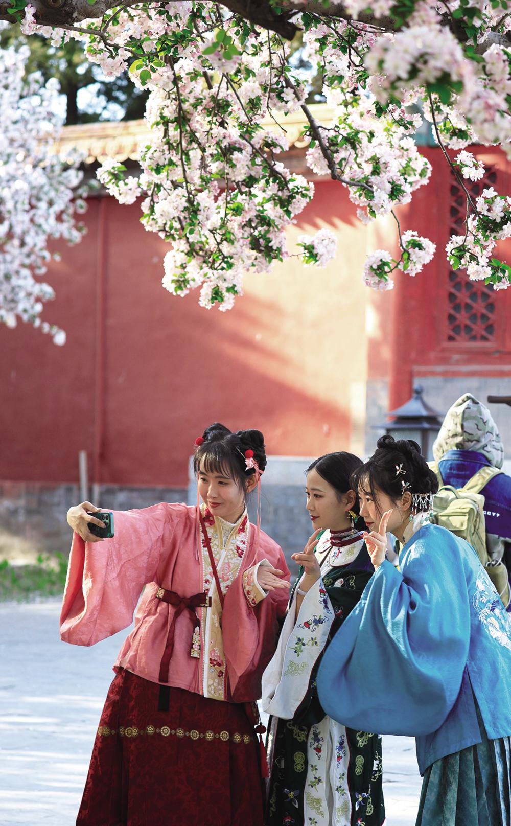 4月5日,游客在北京故宫文华殿前自拍留念。清明时节,人们外出游玩,放松身心。新华社发 刘佳琪 摄