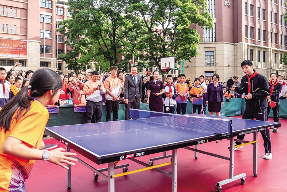 4月8日,马龙(前右)与云南师范大学实验中学学生进行乒乓球友谊赛。 当日,“国球奥运冠军进校园”活动在云南师范大学举行。马龙、许昕、刘诗雯、李晓霞把国球精神带进校园,而西南联大教育救国的历史也为冠军们上了一堂爱国课。 新华社记者 胡超 摄