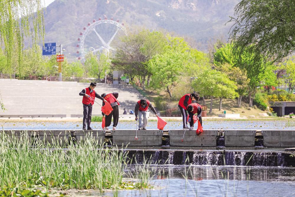 4月21日,志愿者在山东省青岛市李沧区李村河清理垃圾。 第56个世界地球日到来之际,各地开展形式多样的主题活动,倡导人们保护环境,珍爱地球。新华社发 (张鹰 摄)