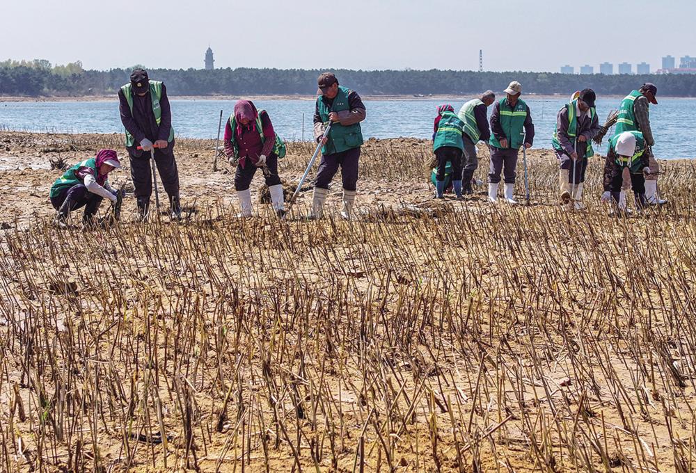▲4月21日,在山东省荣成市桑沟湾海域,园林工人在进行芦苇种植作业(无人机照片)。新华社发 (李信君 摄)