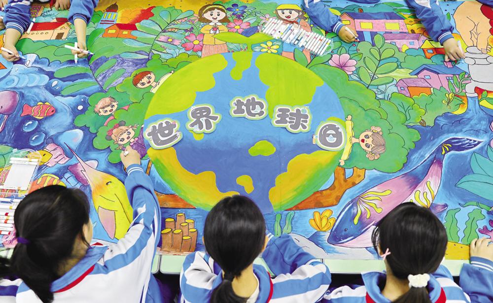 ▲4月21日,河北省秦皇岛市海港区先盛里小学学生在手绘环保长卷。 新华社发 (曹建雄 摄)