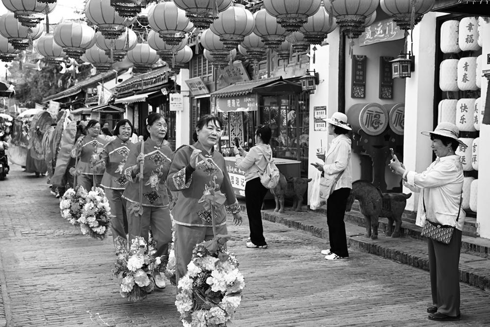 4月27日,非遗表演队伍吸引游人驻足观看。 当日,在江苏省高邮市运河·盂城驿街区,木偶戏、挑花担、撂石锁等非遗项目表演吸引众多游人驻足观看。 近年来,运河·盂城驿街区积极组织非遗进景区,促进当地优秀传统文化传承和发展,推动非遗更好融入百姓生活。 新华社记者 季春鹏 摄
