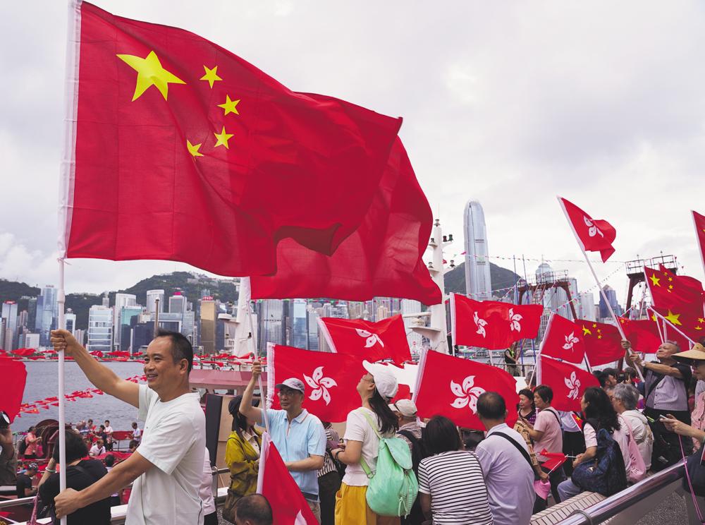 7月1日,在香港尖沙咀海滨长廊,市民手持国旗与特区区旗,欢庆香港回归祖国28周年。新华社发(王申 摄)