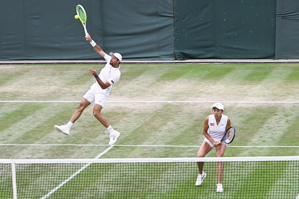 7月7日,张帅(右)/阿雷瓦洛在比赛中。 当日,在英国伦敦举行的2025温布尔登网球公开赛混双四分之一决赛中,张帅(中国)/阿雷瓦洛(萨尔瓦多)组合2比0战胜克劳奇克(美国)/斯库普斯基(英国)组合,晋级四强。 新华社记者 赵丁喆 摄